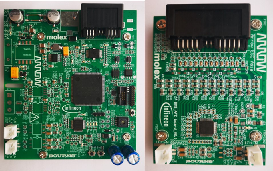 The BMS reference design uses Infineon's CYT2B97CACES, TLE9012DQU, TLE9015DQU, TLE9014SH, TLE9351VSJ, KP256TMA, S6BP201A1A1AST2B20A, and ADI's AD8601WARTZ, TL6654AHS6-1.25#WTRMPBF, LT8301 ES5#WTRMPBF, Si8931D-IS4, Si8921BD-IS4 from Skyworks, SM91502ALA from Bourns, SRP3020TA-2R2M, CDSOT23-T24CAN, SRF3225TAFD-101Y, SRF9045A-701Y, SM8S24CA-Q, and Molex’s 348260160, 348240164, 348260240, 348240244, 5023520200, 50235 10200 and other core chips can be used in electric vehicle applications such as HEV, PHEV, and BEV .